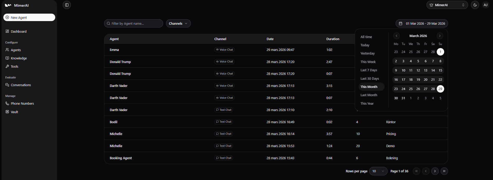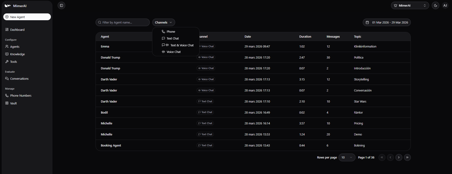 Within this section, you’ll find the conversation history from all channels where your Agents are deployed, providing a unique perspective, actionable insights, and valuable analytics.