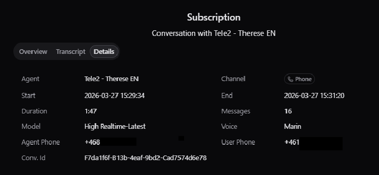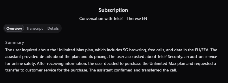 To review a specific conversation, click its row to open detailed view, where you can see the transcript, summary, and key details such as the conversation time, caller’s number (if contacted by phone), the AI model used, and more.
