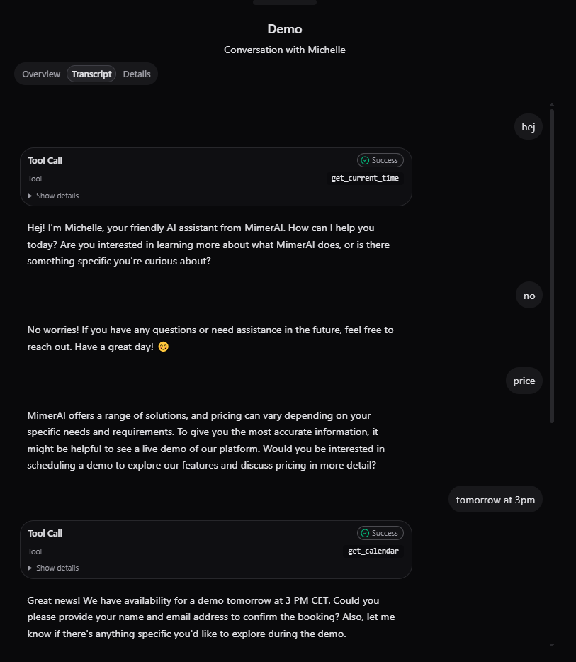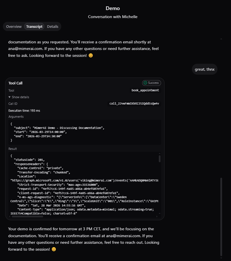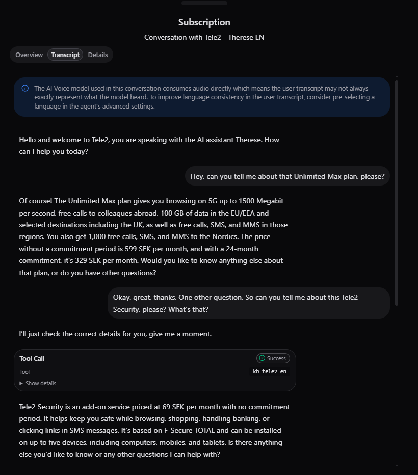 Transcripts also log every knowledge base and tools call. Even these are available for inspection.